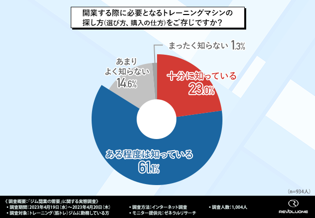 そこで、「開業する際に必要となるトレーニングマシンの探し方(選び方、購入の仕方)をご存じですか?」と質問したところ、『十分に知っている(23.0%)』『ある程度は知っている(61.1%)』『あまりよく知らない(14.6%)』『まったく知らない(1.3%)』という結果となり、8割以上の方が、トレーニングマシンの探し方について把握していることがわかりました。