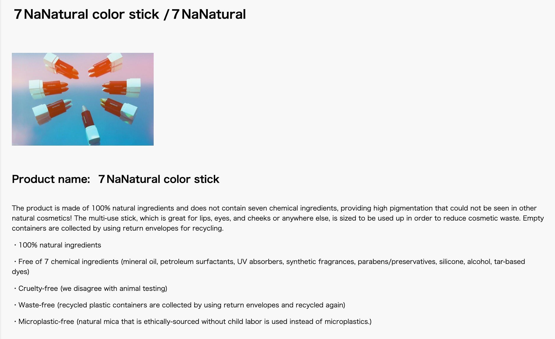 2022年3月にデビューした「人生も、世の中も、ナナイロに。」をコンセプトに掲げるクリーンビューティーブランド。デビュー第1弾となるアイテムは、 唇や目元、頬などに使えるマルチ仕様の7色のカラースティックとカラーパレット。天然由来成分100%でありながら高発色で、うるおいながらもベタつきにくく発色のコントロールがしやすいことが特徴。コスメロスの問題にも着目し、使い切れるミニサイズ設計かつ使い終わった容器の回収・リサイクルまで取り組むなど「ひとと社会が抱える課題」の解決にも積極的に取り組んでいる。