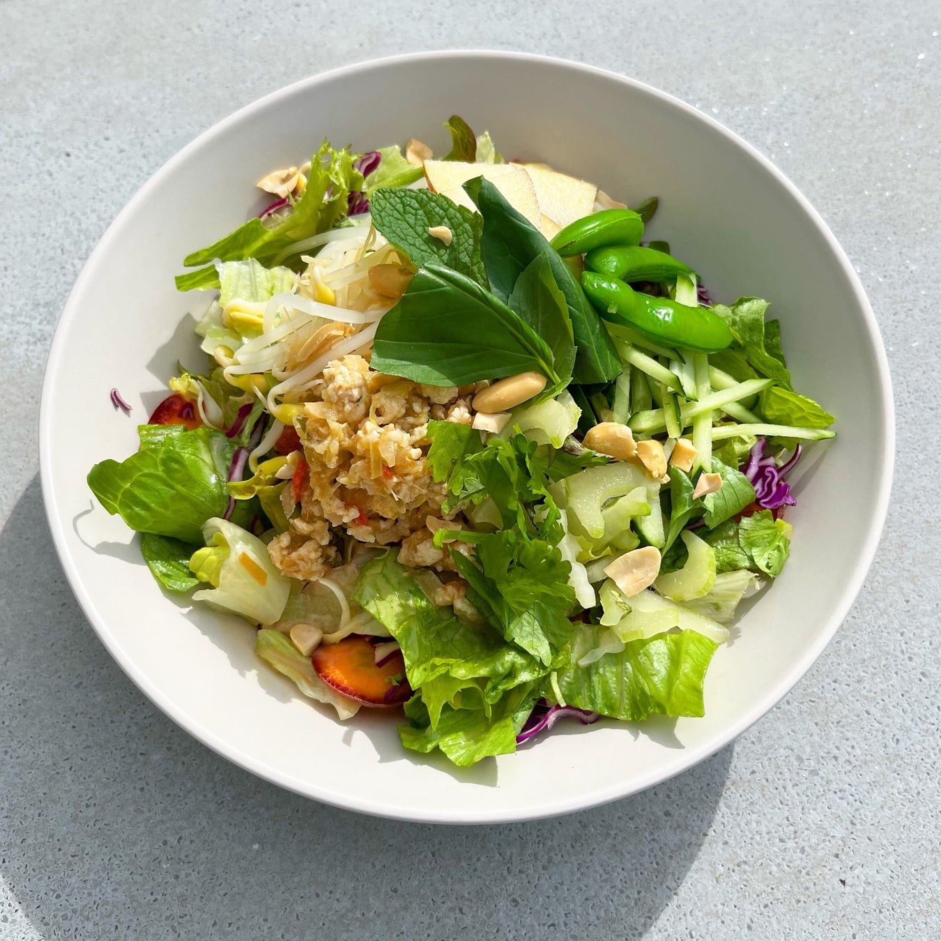 たっぷりと入った野菜のほかには、ナンプラーやこぶみかんの葉、レモングラスを使ってピリ辛に味付けしたアジアン風鶏そぼろを乗せた食べ応えのある一品です。