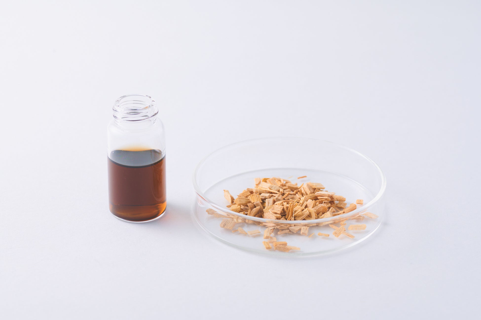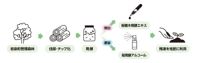 岩手県奥州市に研究開発拠点兼自社工場(奥州ラボ)を持ち、オーガニックエタノールやサステナブルな化粧品原料を開発・製造しているファーメンステーションを共同開発パートナーに迎えて共同開発を行いました。ファーメンステーションが得意とする独自の『糖化・発酵技術』によって、山桜の木部をアルコール発酵することができました。蒸留によってアルコールを取り除いた後にエキスを抽出しています。エキスの抽出残渣は、堆肥に混ぜて畑に還元することを目指しています。原料となる原木伐採から始まって、全ての行程でトレーサビリテイが確保されています。
