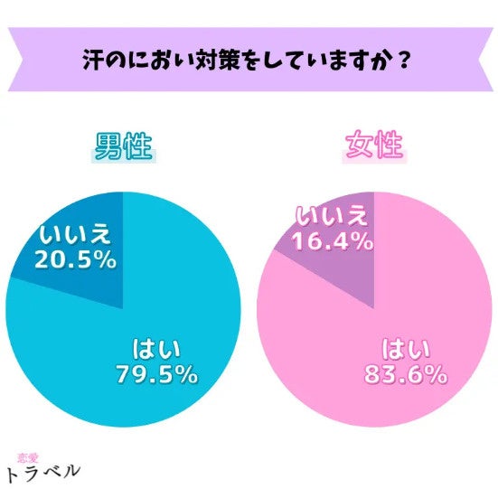 汗のにおい対策について全国の男女100名にアンケートを取った結果、男女ともに約8割の方が対策をしているということがわかりました。