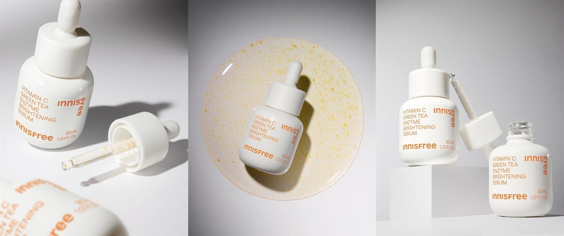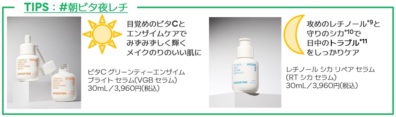 イニスフリーは、肌に素早く浸透*5する一方で角質細胞の間にある脂質になじみにくく、壊れやすい性質を持つ「水溶性ビタミンC誘導体*6」と、ゆっくり浸透*5する一方テクスチャーがべたつきがちな「油溶性ビタミンC誘導体*7」、2種類をバランスよく組み合わせたデュアルビタミンC誘導体*4を配合。素早く肌のすみずみ*5までビタミンCの成分をいきわたらせることを目指しました。