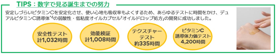 今回採用された特許成分「グリーンティーエンザイム*2」は、チェジュ島にある茶葉の中から抽出した独自の茶葉酵素*2です。低刺激処方*5でありながら、古い角質をマイルドにケアして肌の凹凸やキメをなめらかに整え、毛穴を目立ちにくくさせます。肌に素早く浸透*6する水溶性ビタミンC誘導体*7と、肌にゆっくり浸透*6する持続型の油溶性ビタミンC誘導体*8を配合した独自の「デュアルビタミンC誘導体*1」は、2種類のビタミンC誘導体*9を安定化させるオイルカプセル処方を採用することで、素早くかつゆっくりとビタミンCを肌のすみずみ*6までいきわたらせます。また、「グリーンティーエンザイム*2」との併用により、「デュアルビタミンC誘導体*1」原料単体使用と比較し、抗酸化作用140%アップ(原料特性に限る)との結果が得られています。