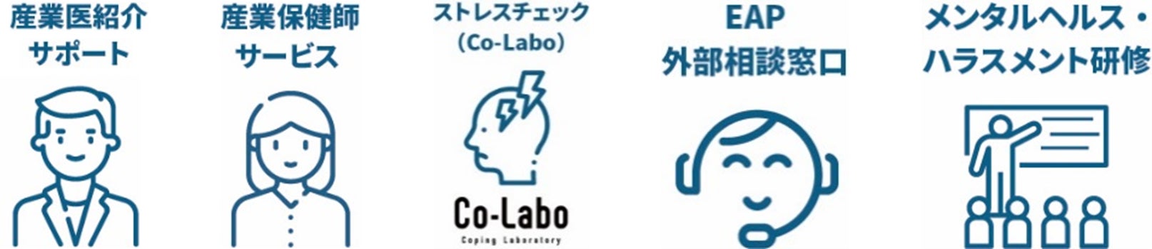 『産業保健トータルサポート』では、医師紹介業19年のノウハウとネットワークによる産業医紹介・選任後の業務サポートをはじめ、ストレスチェック『Co-Labo』、産業保健師サービス、EAP外部相談窓口、メンタルヘルス・ハラスメント研修、専門家相談サービス等で、企業の健康経営を総合的に支援しています。