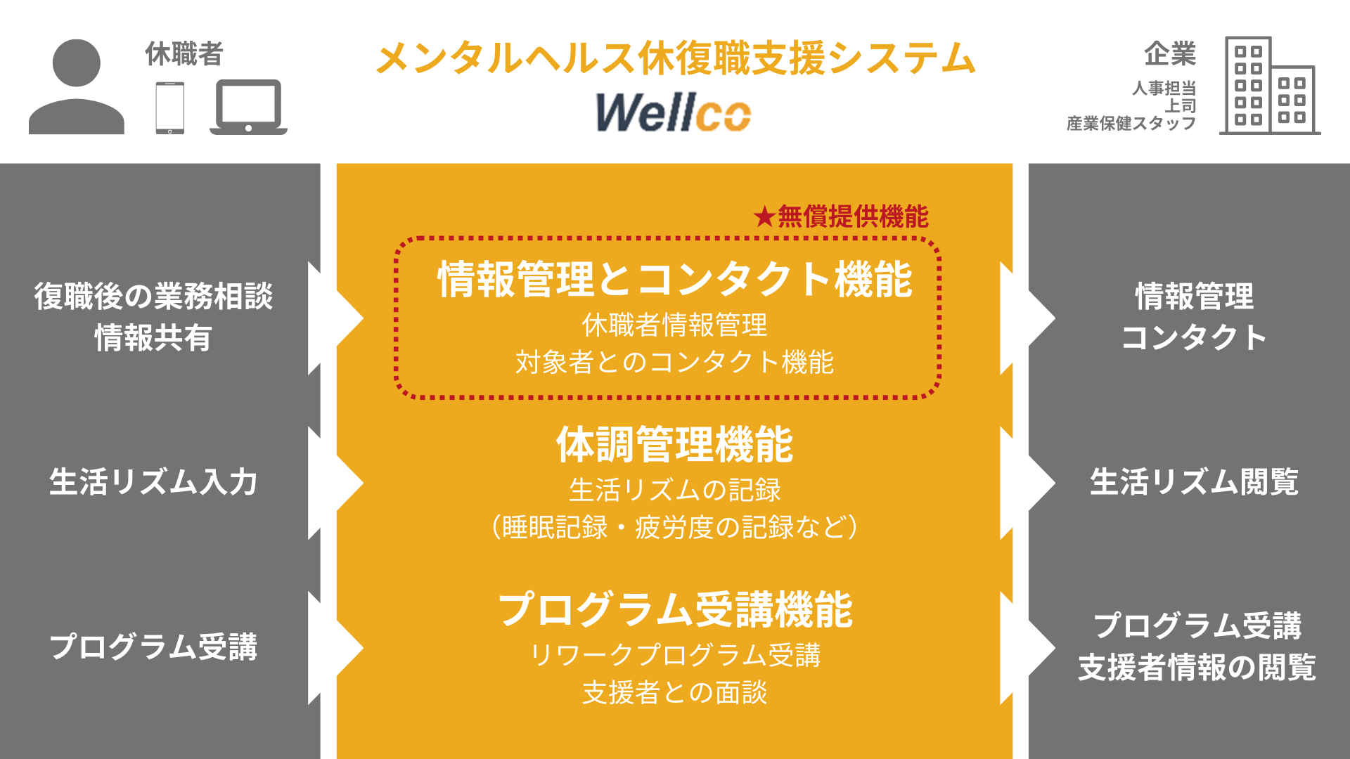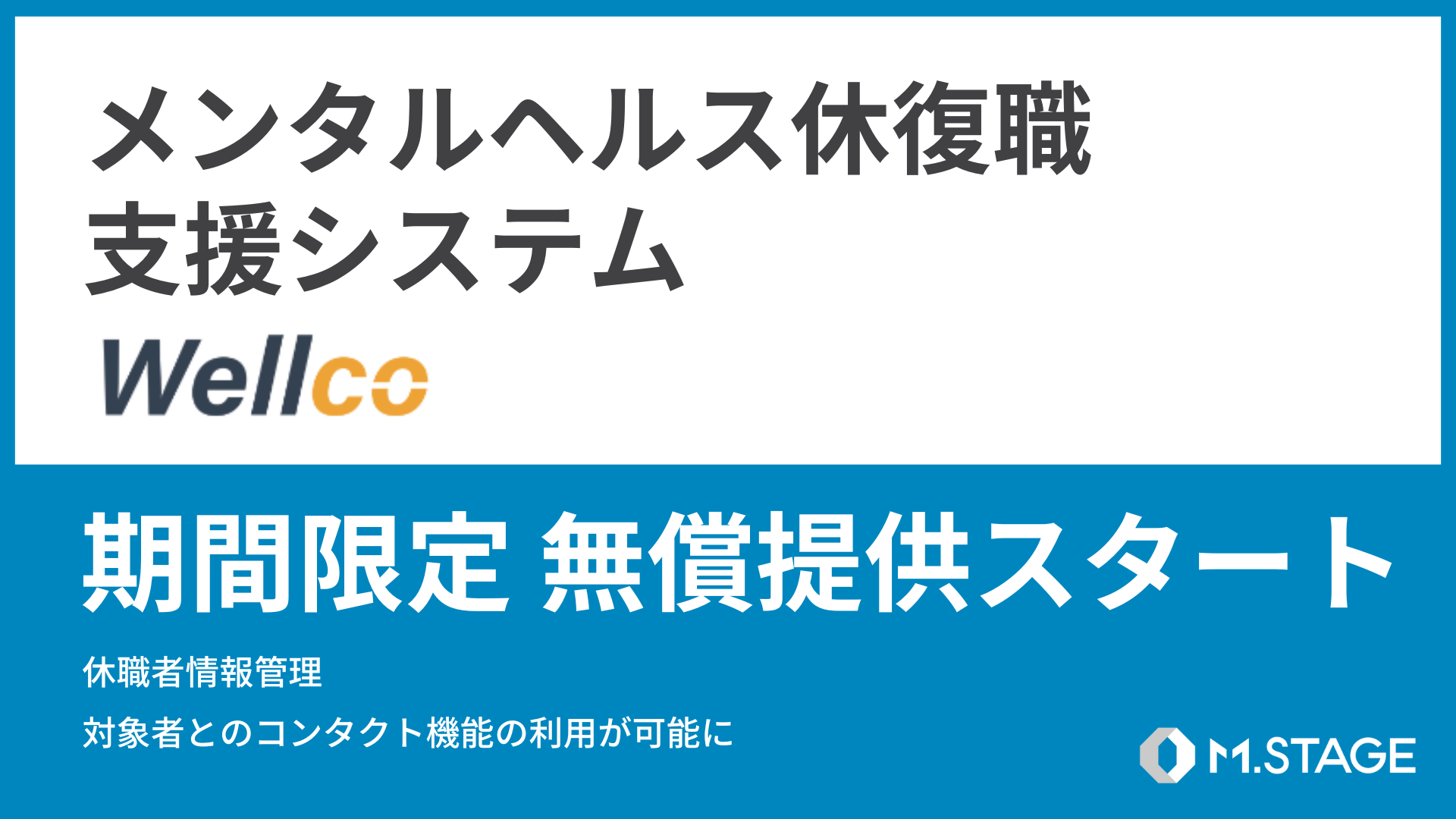 そしてこの度、ご好評につき『オンラインリワーク支援』のサービスの要となる、メンタルヘルス休復職支援システム『wellco』の一部機能を2023年6月末までにお申し込みいただいた法人のお客様に対し、1年間無償提供いたします。この機能により、「企業内における全休職者の情報管理」「全休職者と企業側とのコミュニケーション」といった、企業におけるセンシティブ情報の管理が可能になります。また、すでにエムステージの『産業保健トータルサポート』をご利用いただいている法人のお客様は、2023年6月15日より、サービスご利用中に限り、無期限で本機能を無償でご利用いただけます。
