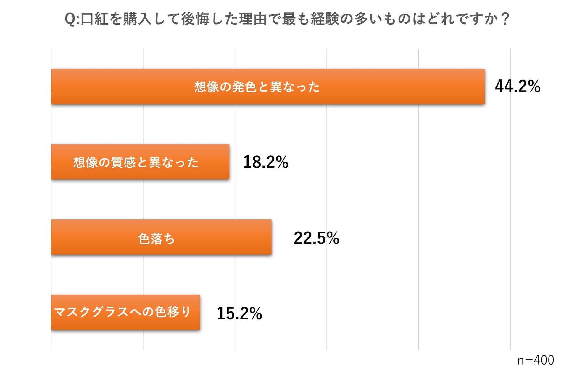 口紅の購入について質問すると、口紅を購入して後悔した経験のある女性は全体の約半数となりました。後悔した理由として「想像していた発色と異なった」という回答が最も多く、44.2%。また、「口紅を購入する上で悩みがある」と回答した女性に具体的な内容を質問したところ、「自分に合った色が分からない」という回答が最多となりました。個人の唇のベースカラーによって、目で見た発色と実際に口紅を塗ったときの色のギャップはそれぞれ異なります。それに伴い、“そもそもどんな色の口紅を選べばよいのか”と悩みを抱える女性は少なくないようです。