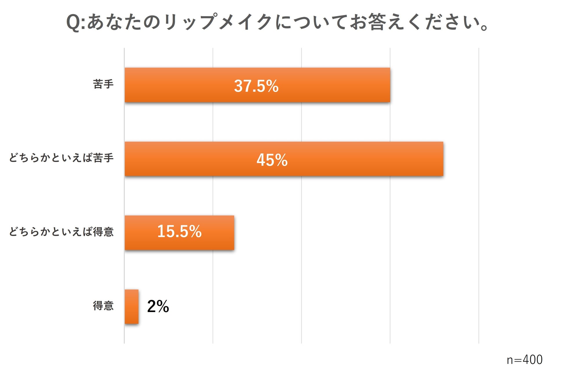アンケートでは、口紅とリップメイクに関する悩みや意識を調査。自身のリップメイクについて伺うと、「苦手だ」「どちらかといえば苦手だ」との回答が8割以上を占める結果となり、リップメイクに苦手意識を持つ女性の割合が多いという事実が明らかになりました。