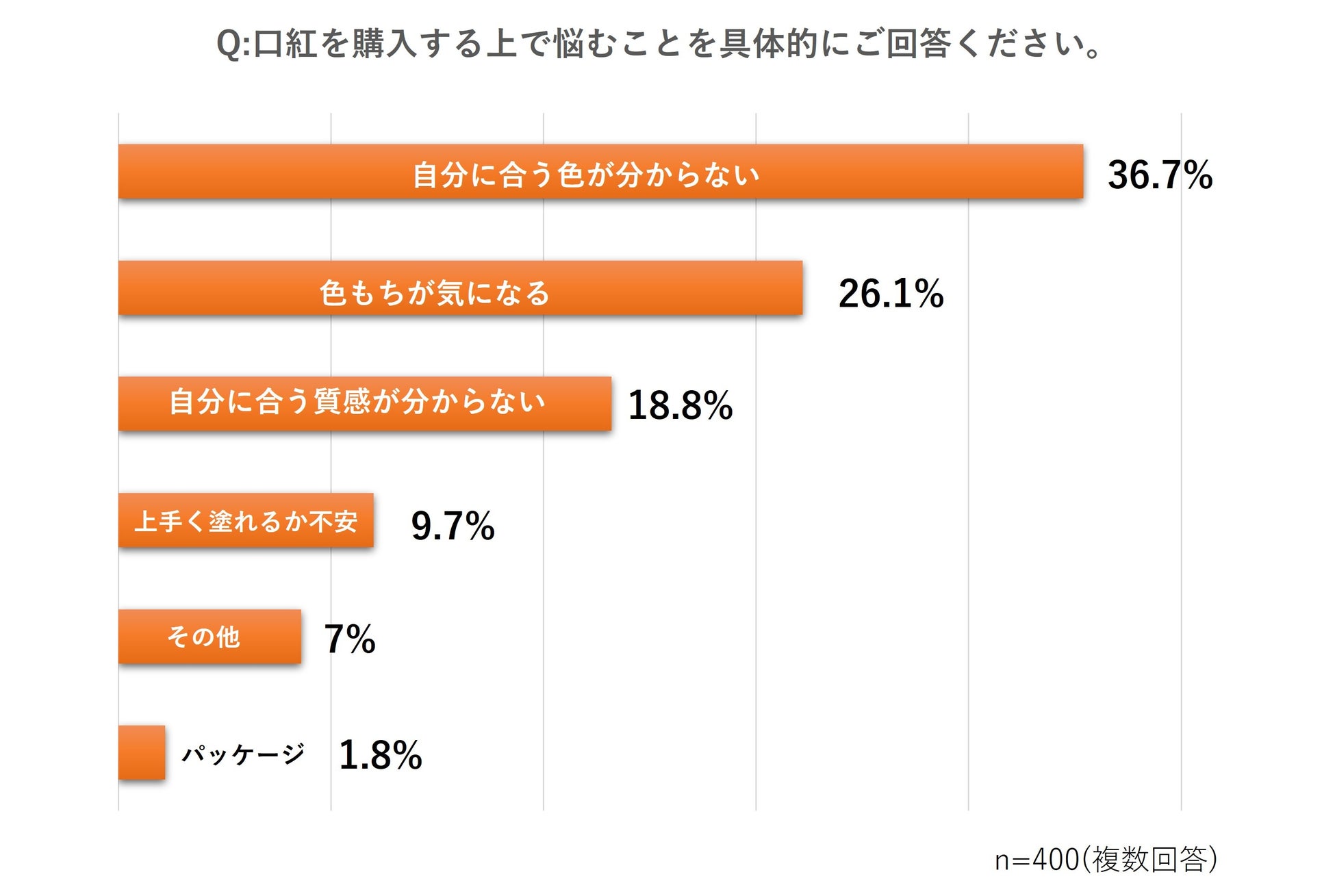 今回の調査では、“脱マスク”の影響で化粧品の需要回復が見込まれる一方、口紅の購入時における悩みが増加していることが分かりました。具体的には、「自分に合った口紅の色が分からない」「色もちが気になる」といった悩みが調査全体の半数以上を占める結果となっています。