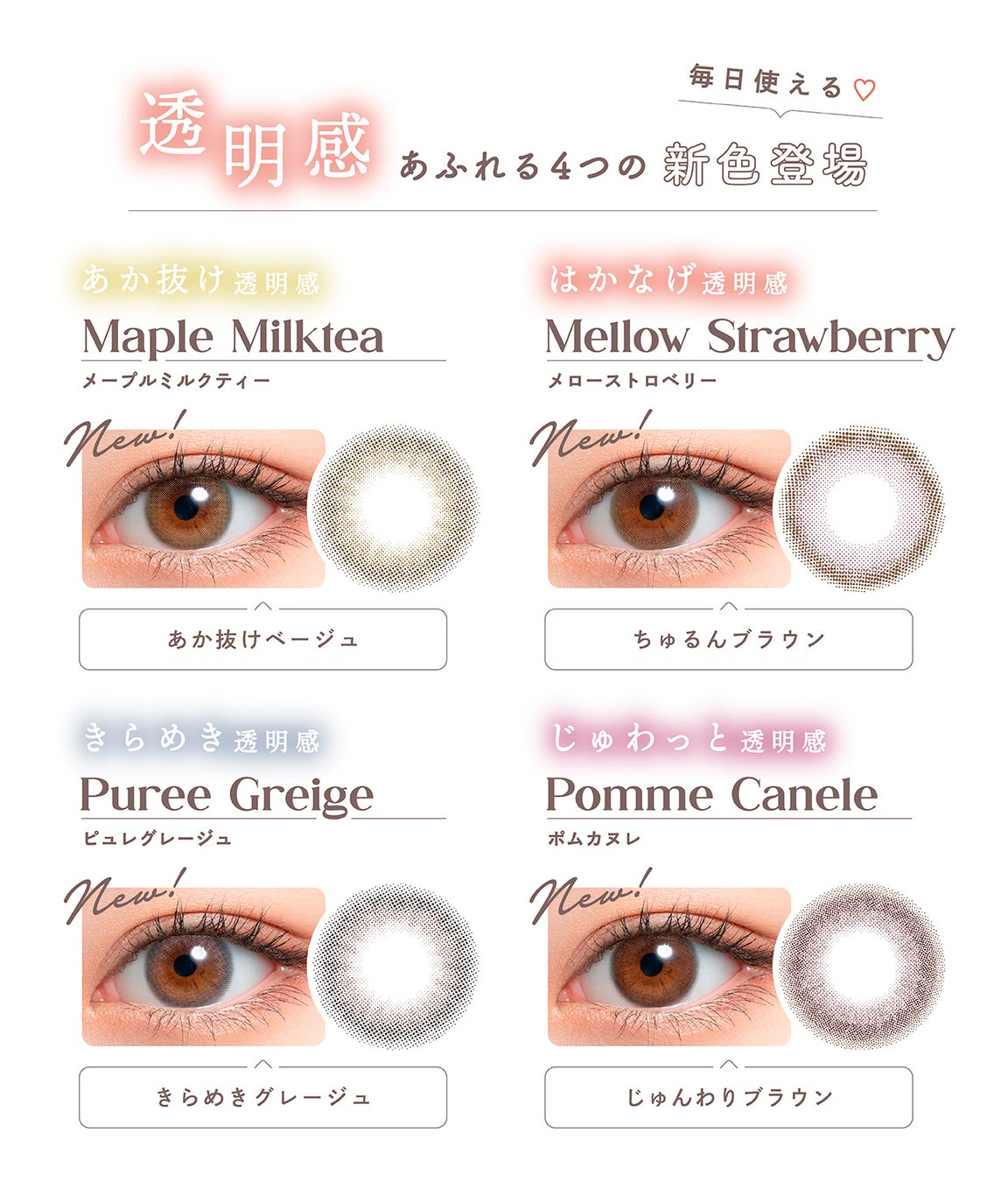 裸眼の色が明るい「茶目」のタイプ、暗めな「黒目」のタイプ、どちらのタイプの瞳の方が着けても不自然にならずあか抜ける全8種のラインナップです。