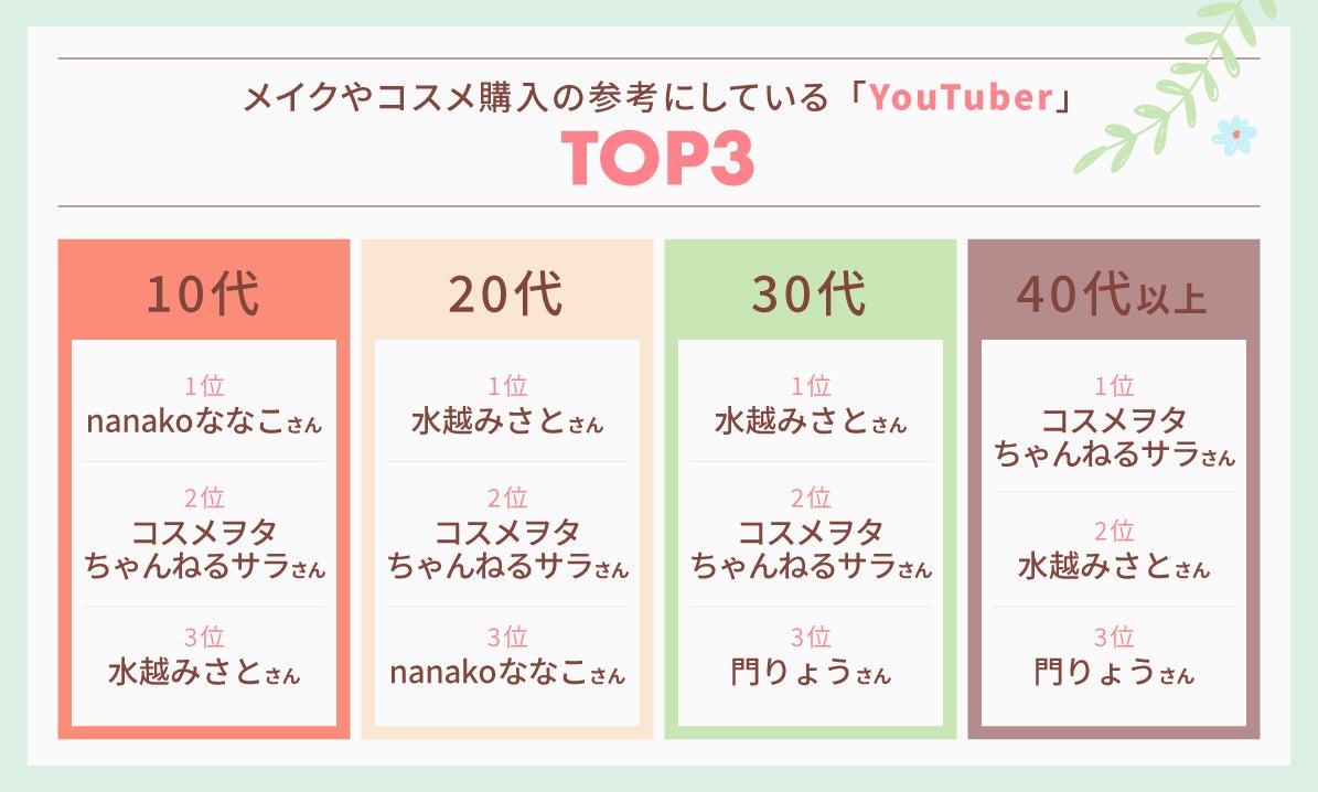 さらに、10代は「動画のテンポがいい」、「プチプラを中心にしていて真似しやすい」、「分かりやすい」との声で圧倒的に【nanakoななこ】さん支持の層が厚く20代以降は【水越みさと】さん30代以降は【門りょうさんを参考にしている人も多いという結果に。
