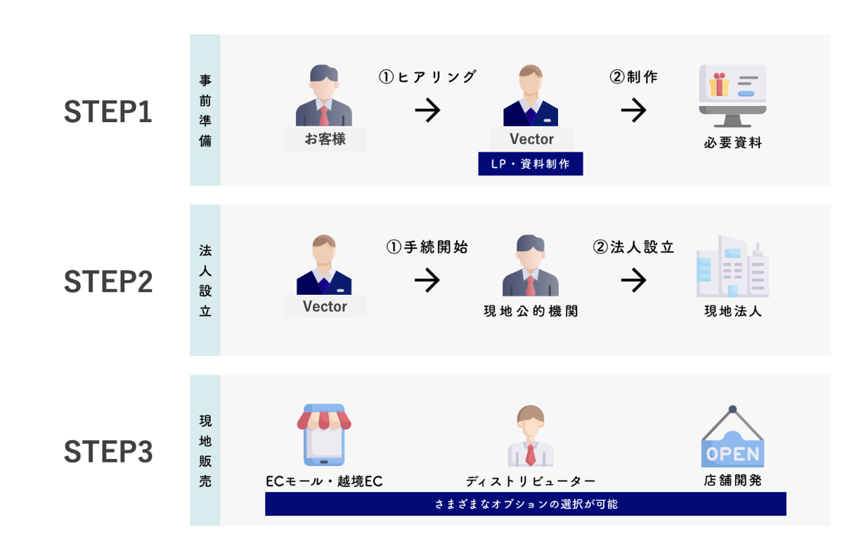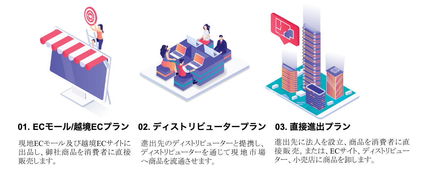 サービスプランはお客様の進出戦略に応じて、01.ECモール・越境ECプラン、02.ディストリビュータープラン、03.直接進出プランの3タイプを提供いたします。なお、進出に関する相談は無料でご対応しております。