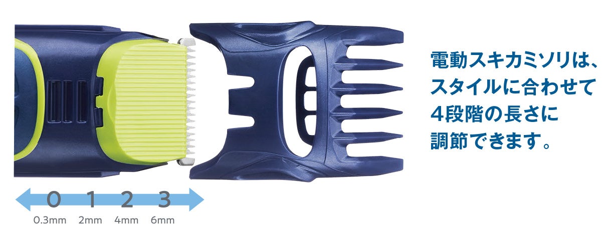 これ一本で特定の部位だけではなく、全身のボディヘアを梳く・整える・剃る・肌を潤すといったケアに利用できる「マルチボディシェーバー」。4段階に調整可能な「トリマーアタッチメント」により好みの長さに整えることも可能。