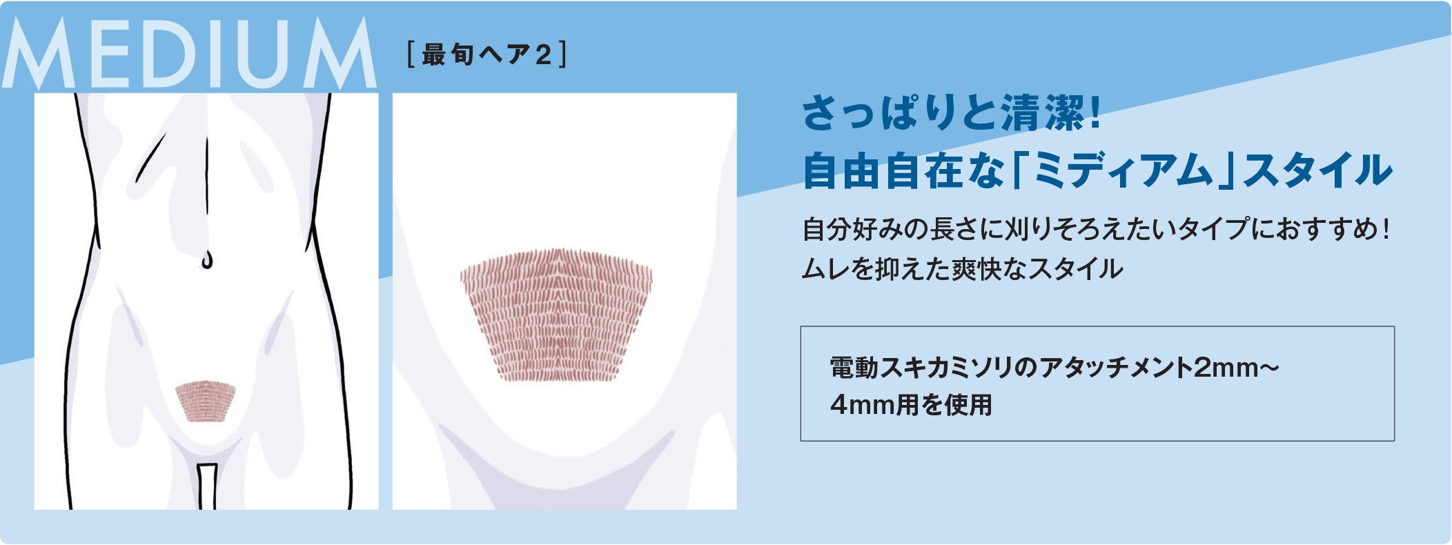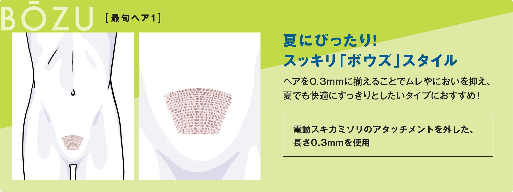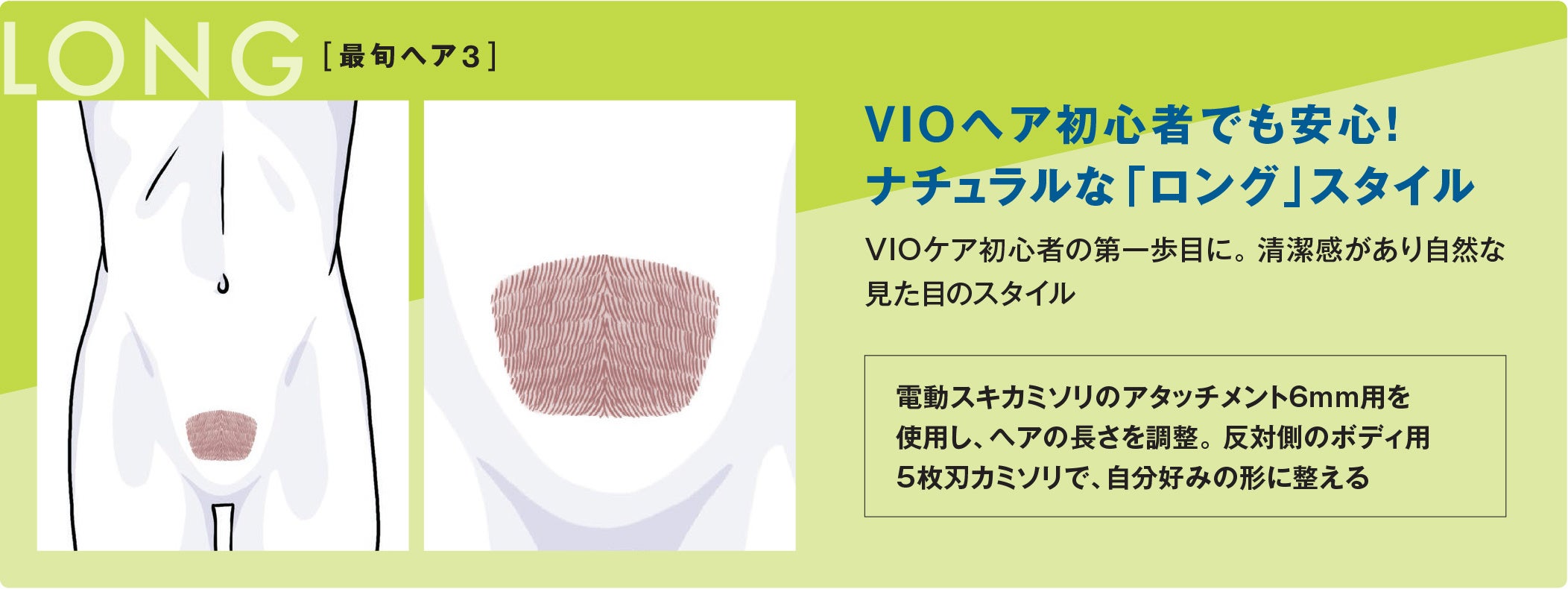 そこで、シックは自分でVIOのセルフケアに初めて挑戦する方にも分かりやすいよう、ボウズ・ミディアム・ロングの3つのスタイルを提案する「メンズVIOヘアカタログ」を公開します。