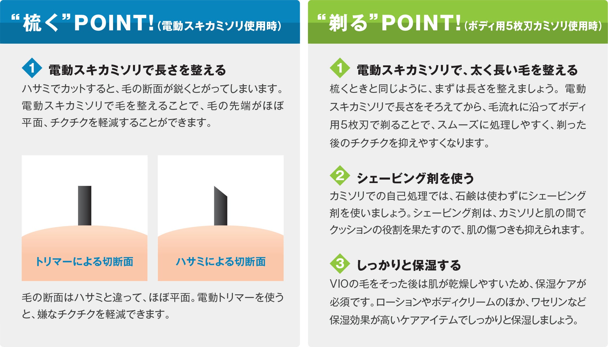 VIOヘアに限らず、体毛をケアした際に起こりやすいのが、肌の“チクチク”の悩み。“チクチク”の原因の1つは、剃った毛先が鋭くとがってしまうから。そのほかにも、シェービング剤を使わない、保湿をしないなどの理由で皮膚が乾燥してカサつくと、チクチクとしたかゆみを感じることがあります。
