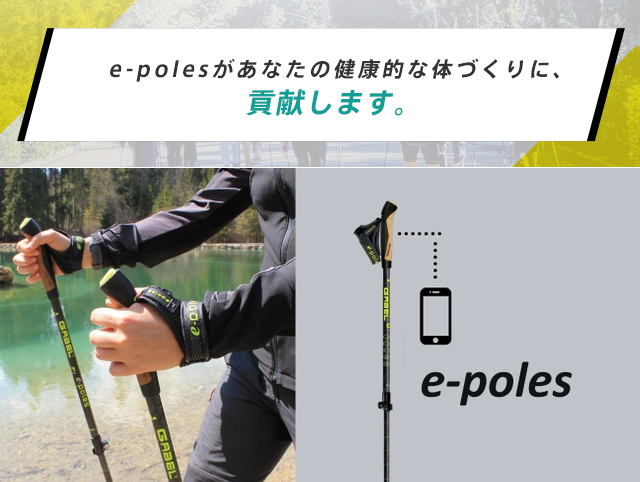 【e-poles】はイタリアの欧州のトップブランドGABEL(ガベル)が、世界33ヵ国のノルディックウォーキング協会とノルディックウォーキングの専門家、工学及びITエンジニア、医師など延べ50名以上の専門家と開発。トップアスリート用の品質IOTを組み合わせた画期的なノルディックポールです。