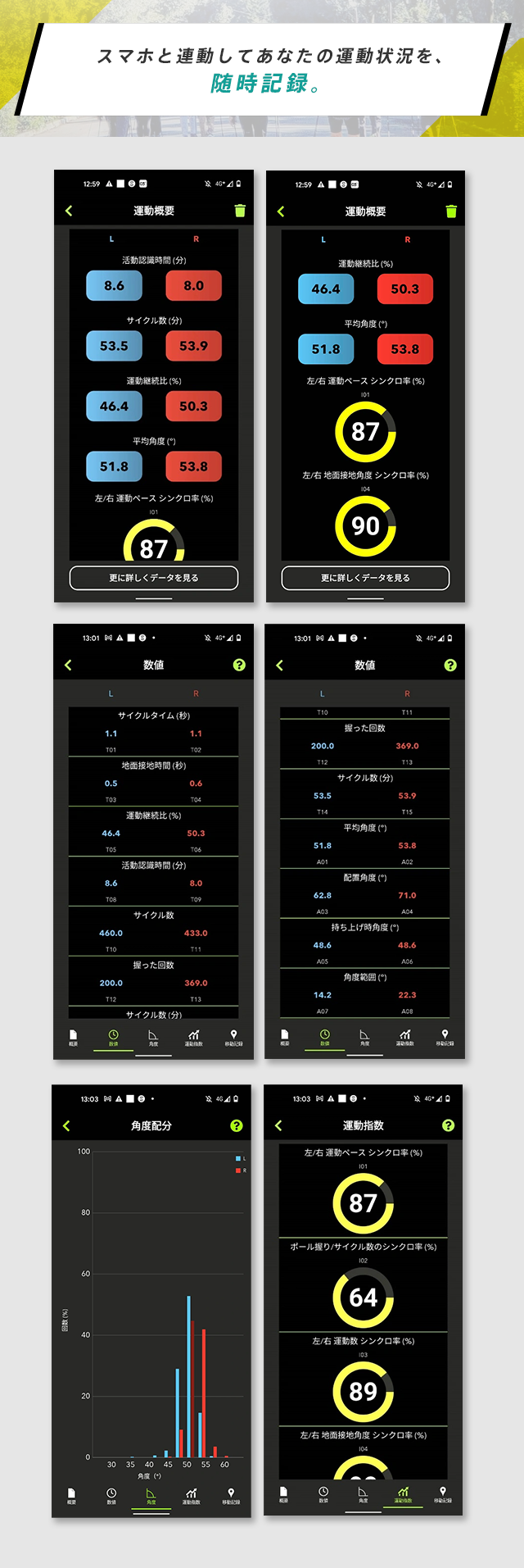 運動時間、心拍数、消費カロリーといった基本的なメニューはもちろん、ウォーキングのスピード、グリップやポールの角度、ポールで地面を突いた回数や時間的な間隔など左右の差を細かく分析可能です。