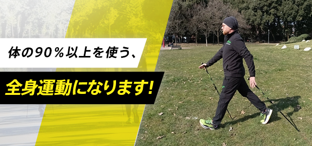 ポールを2本持って歩くことで膝や腰に不安がある方でも、負担を掛けずに有酸素運動できます。