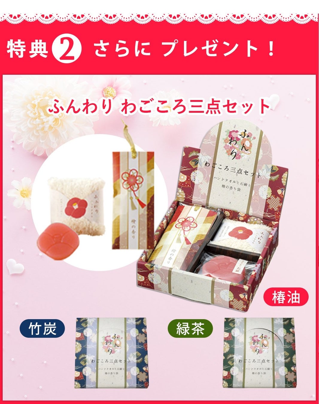 これは、まくらぼで人気No.1のオーダーメイド枕ギフト券に、特典としてハンドタオル、石鹸、香り袋がセットになった「ふんわりわごころ三点セット」、カーネーション(アートフラワー)、そして、ギフトラッピングがついたこの時期だけの特別なギフトです。