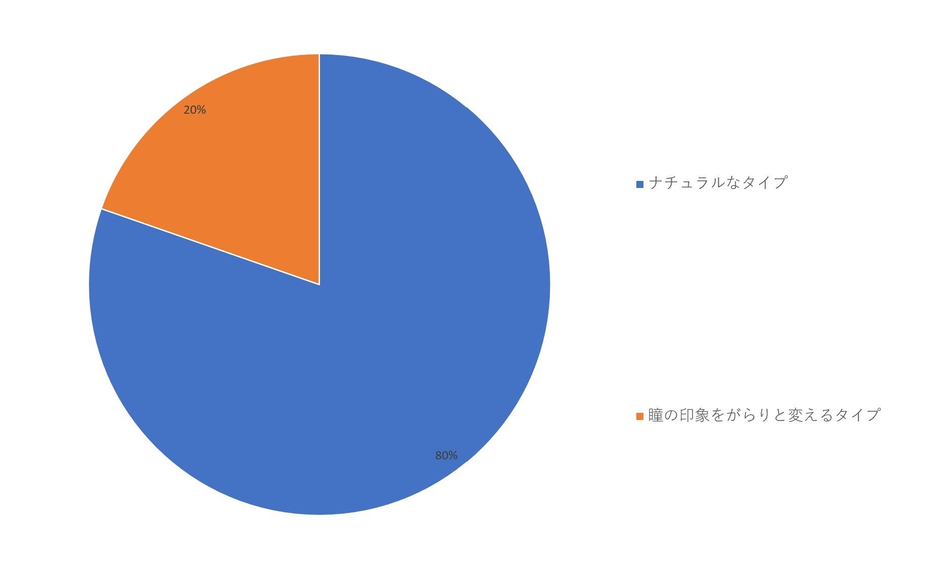 「どちらのカラコンのタイプをよく選びますか?」という質問では、「ナチュラルなタイプ」の回答が80パーセント、「瞳の印象をがらりと変えるタイプ」の回答が20パーセントという結果になりました。