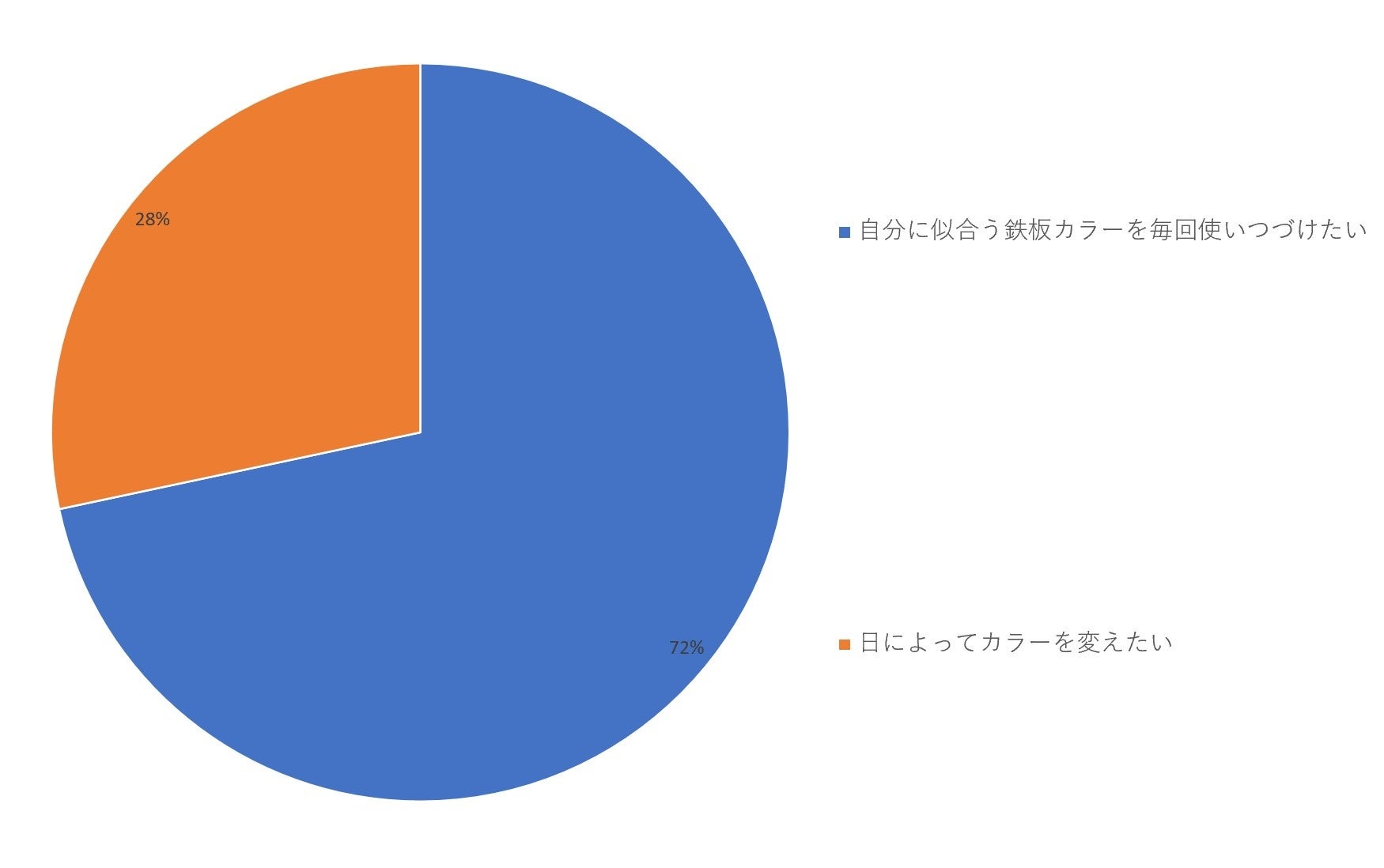「カラーについて、あなたの考えに近いのはどちらですか?」という質問では、「自分に似合う鉄板カラーを毎回使いつづけたい」の回答が72パーセント、「日によってカラーを変えたい」の回答が28パーセントという結果になりました。