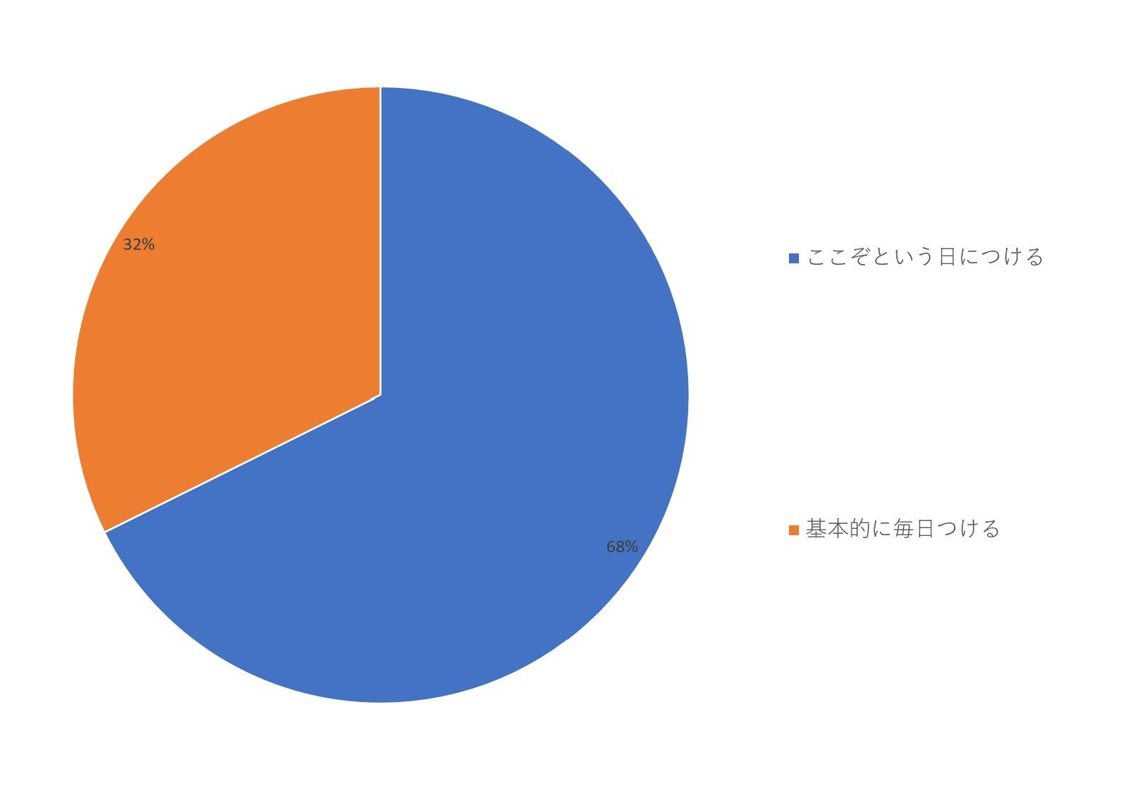 「カラコンをつける頻度はどちらですか?」という質問では、「ここぞという日につける」という回答が68パーセント、「基本的に毎日つける」の回答が32パーセントという結果になりました。