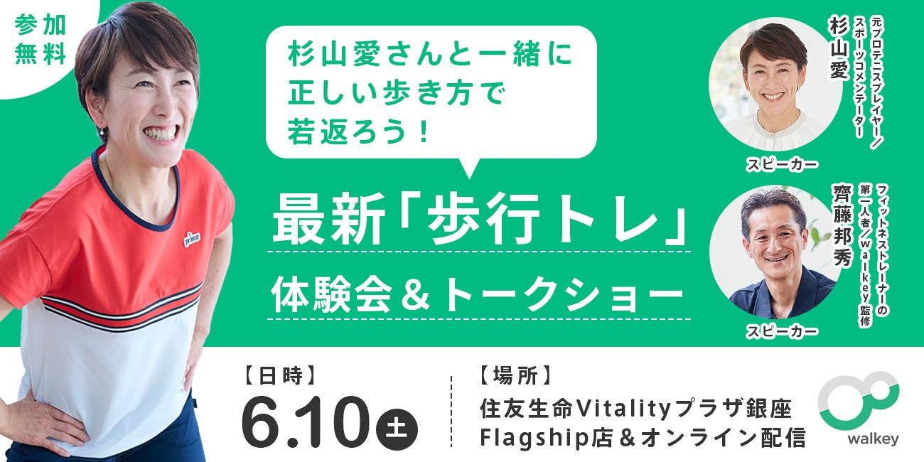 株式会社walkey(本社 東京都目黒区、代表取締役社長 渡辺達哉)は、6月10日(土)、元プロテニスプレーヤーの杉山愛さんをゲストに、リアルとオンライン両方で楽しめる、最新「歩行トレ」体験会&トークショーを開催します。