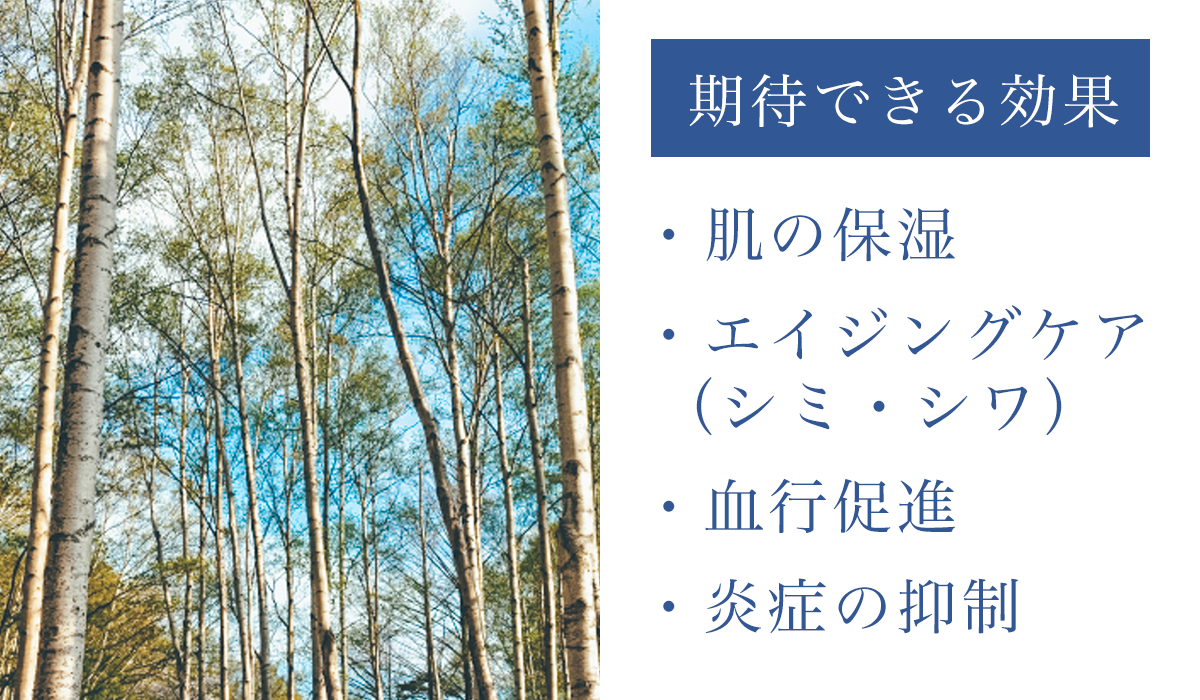 北海道の厳しい大地で育つ白樺。白樺樹液には、肌の保湿・引き締めなどのスキンケア効果があります。肌のターンオーバーを促進し、上質なアミノ酸やミネラルにより、すぐれた角質を形成する作用が認められています。また白樺の「樹の根細胞」を通過して吸い上げられた樹液の水分は粒子が小さいので浸透率が高く、近年その効果が注目されています。