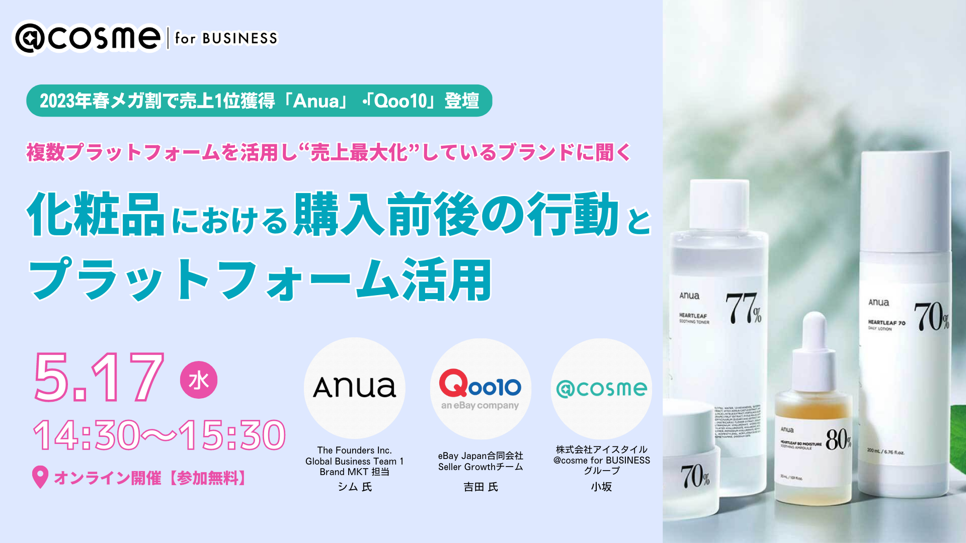株式会社アイスタイル(代表取締役社長 兼 COO:遠藤 宗)は、2023年5月17日(水)に、ウェビナーイベント『複数プラットフォームを活用し“売上最大化”しているブランドに聞く化粧品における購入前後の行動とプラットフォーム活用』を開催することをお知らせいたします。