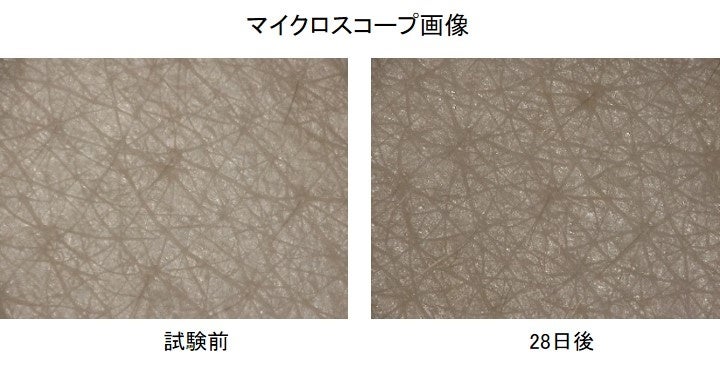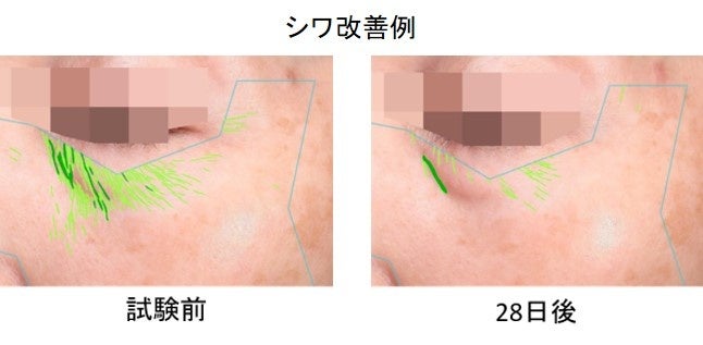 20名の女性を対象に「イーストヴェール」3%配合した乳液を朝晩2回塗布し、使用前と28日後で肌の各種測定を行いました。その結果、有意にシワ個数が減少することが示され、シワが改善することが明らかとなりました。さらに、角層水分量も約1.3倍と有意な増加を示しました。