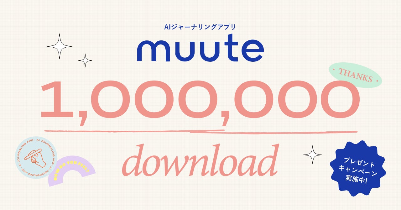 プロダクトスタジオのミッドナイトブレックファスト株式会社(本社:東京都渋谷区、代表取締役:喜多紀正、以下、「当社」)が開発・運営するAIジャーナリングアプリ「muute」が、2020年12月のサービスローンチから約2年で累計100万DLを記録しました。多くの皆様にご利用いただいている感謝の気持ちとして、この度、ユーザーの皆様の声を集めた「100万DL記念特設WEBサイト」、及び期間限定での「プレミアムプラン割引キャンペーン」を実施いたします。