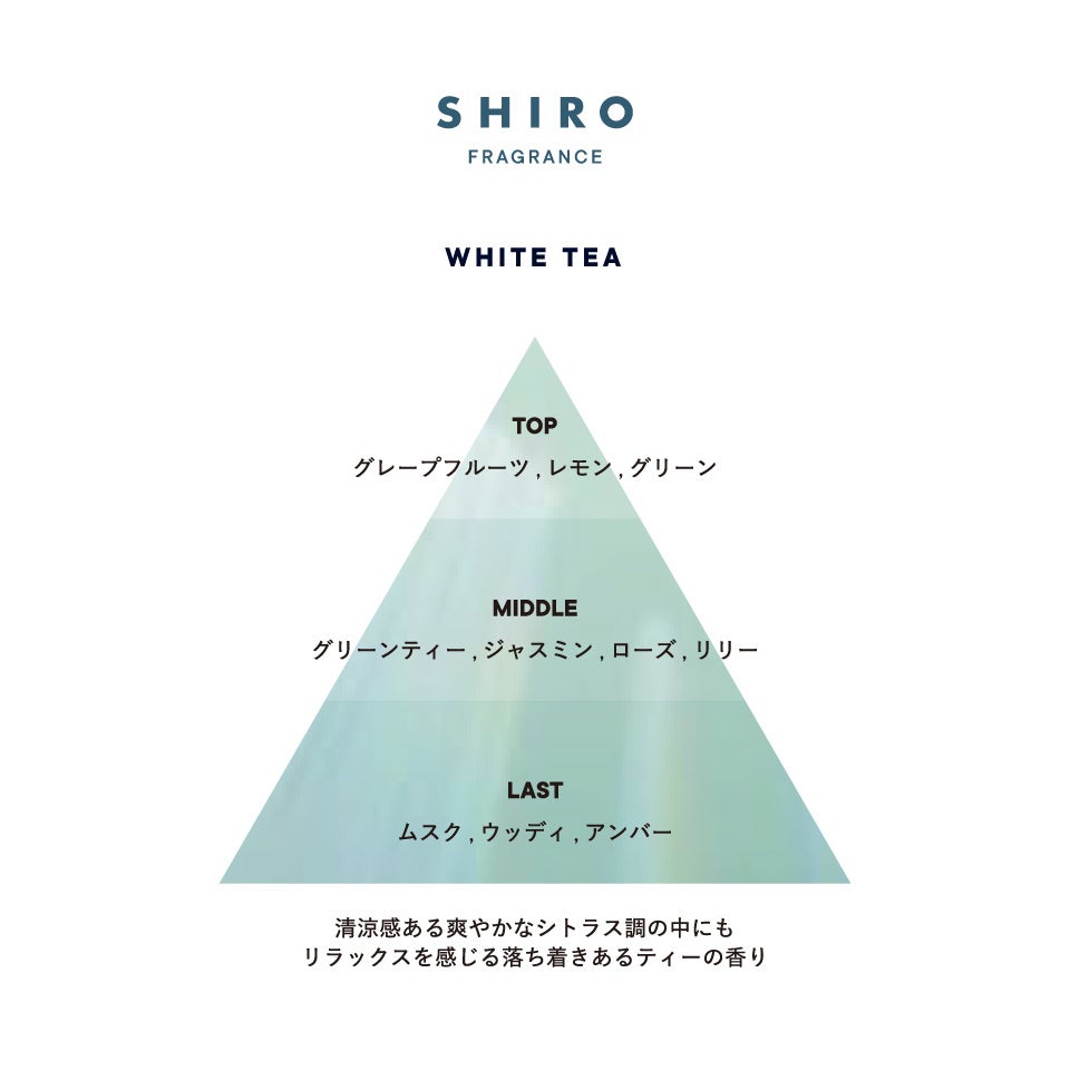 清潔感ある爽やかなシトラスの香りの中に落ち着きあるティーの香りが特長なので季節を問わず、誰にでも寄り添う香りです。フレッシュでリラックス感ある香りがお好きな方におすすめです。
