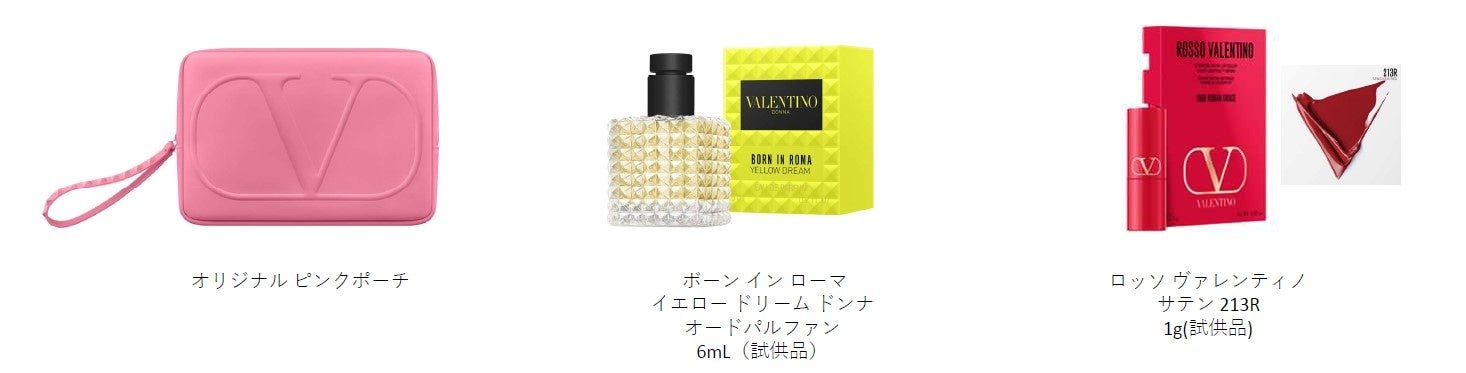 22,000円(税込)以上ご購入の方には、さらにボーン イン ローマ イエロー ドリーム オードパルファン( 試供品)及び、ロッソ ヴァレンティノ サテン 213R ( 試供品)をプレゼントいたします。