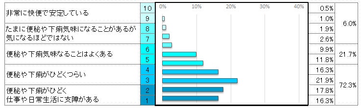 「便秘や下痢がひどくつらい」38.2%と「便秘や下痢がひどく仕事や日常生活に支障がある」34.1%を合わせて72.3%となります。