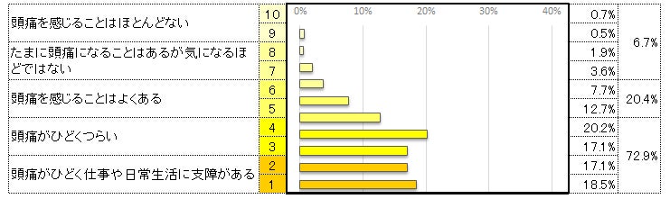 「頭痛がひどくつらい」37.3%と「頭痛がひどく仕事や日常生活に支障がある」35.6%を合わせると72.9%に達しています。