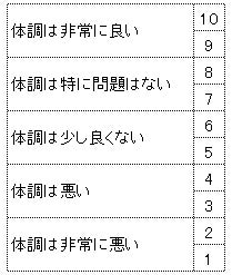 体調自己評価アンケートでは、「体調は特に問題はない」状態を7-8点に置くことで、体調の不調のレベルを細かく評価できる評価点配分を行っています。