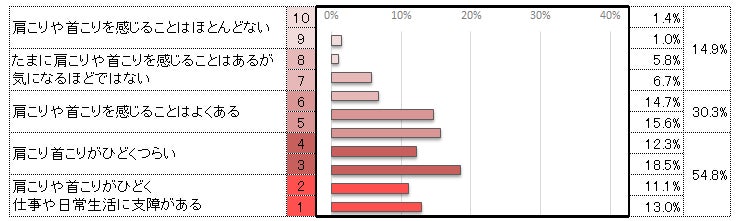 「肩こり首こりがひどくつらい」30.8%と「肩こり首こりがひどく仕事や日常生活に支障がある」24.0%を合わせて54.8%ですが、「肩こりや首こりを感じることはよくある」まで含めると85.1%になります。