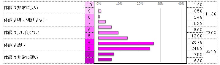 今回のBP健康動態調査の結果として特徴的な点は、体調全般に対して「体調は悪い」「体調は非常に悪い」を選択した方が全体の65.1%と非常に高い比率であることです。