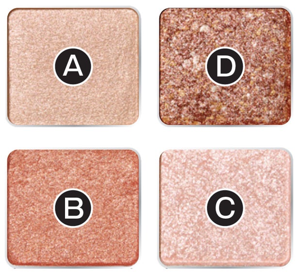 目元:ⒹとⒺを混ぜ、まぶた全体にのせた後、その上にⒶ~Ⓒを重ねることで自然な立体感を演出