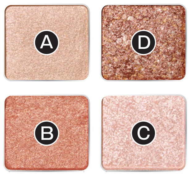 目元:ⒹとⒺを混ぜ、まぶた全体にのせた後、その上にⒶ~Ⓒを重ねることで自然な立体感を演出