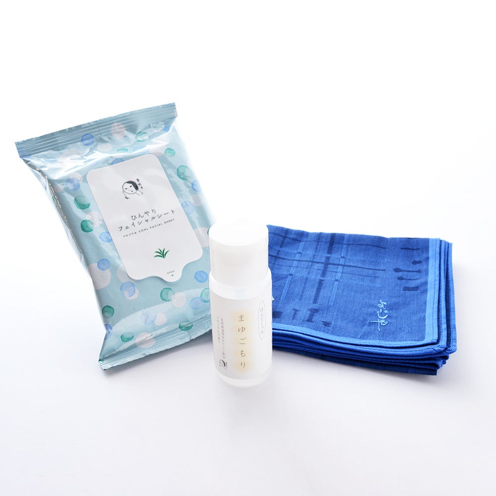 「まゆごもり」のほのかなフローラルの香りに包まれながら手指の消毒※ができる「まゆごもり はんどじぇる」。さらに今年の5月に発売した季節限定「ひんやりフェイシャルシート」の3点を限定パッケージに入れてギフトセットにいたしました。