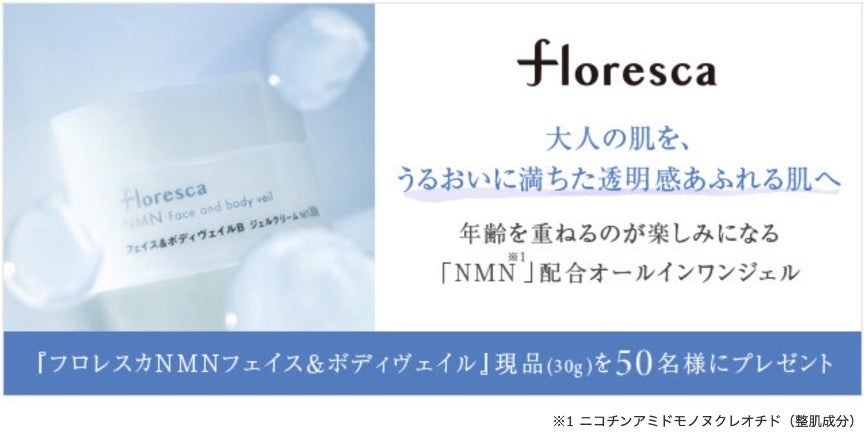 @cosme内にて、「フロレスカNMNフェイス&ボディヴェイル 30g」を50名の方にプレゼントさせていただくキャンペーンを実施いたします。