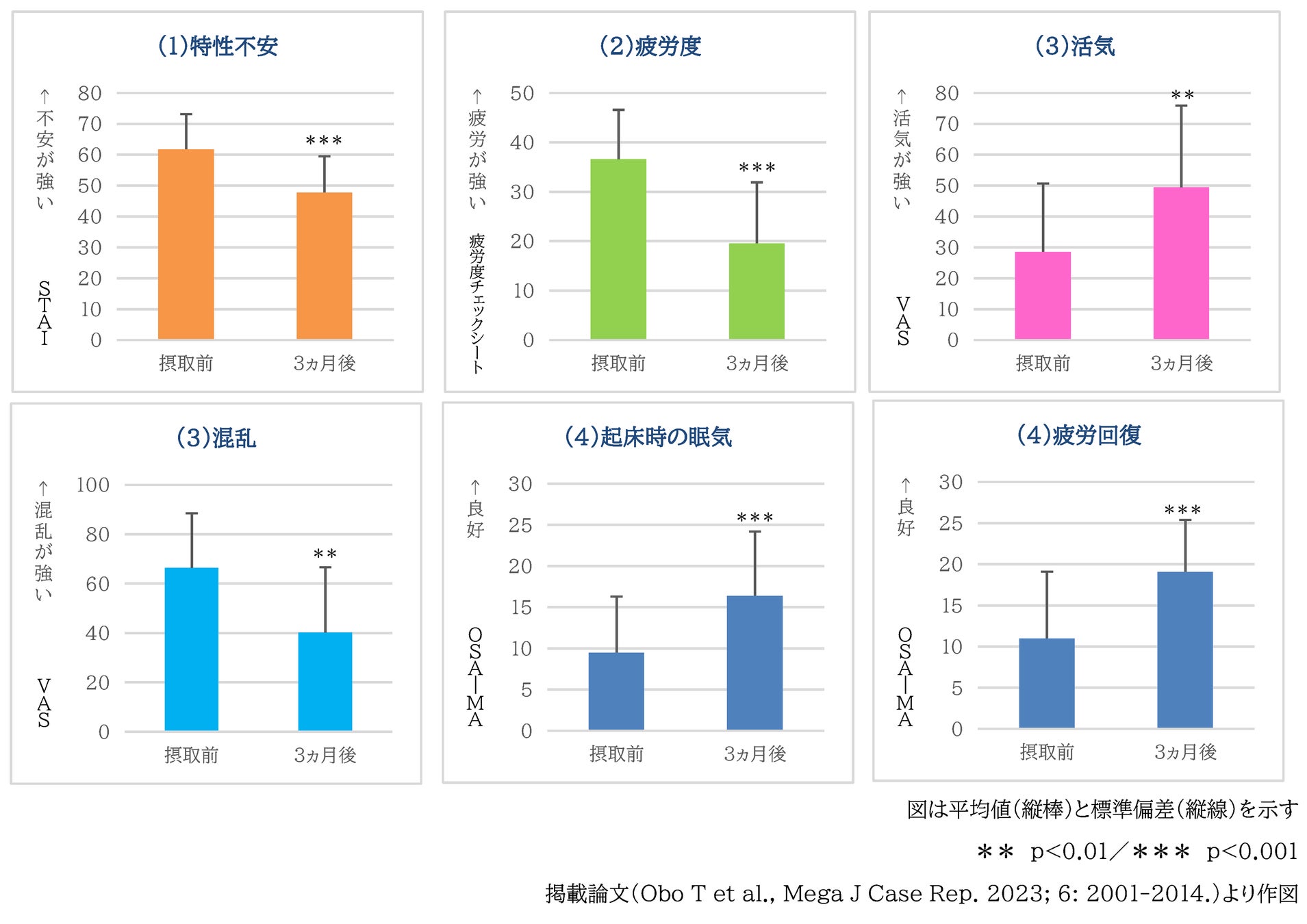 うつ病患者は常に不安や緊張状態が続くため疲労が強まりやすい傾向にありますが、「身体的疲労」も「精神的疲労」も徐々に軽減され、摂取3カ月後には有意な軽減が認められました。