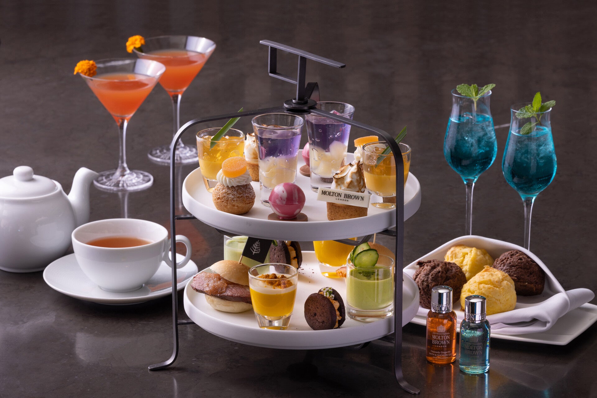 コラボレーションアフタヌーンティーでは、モルトンブラウンのフレグランスコレクションの成分や色味にインスパイアされた、心身ともに爽やかにリフレッシュできるような清涼感あふれるメニューを展開いたします。