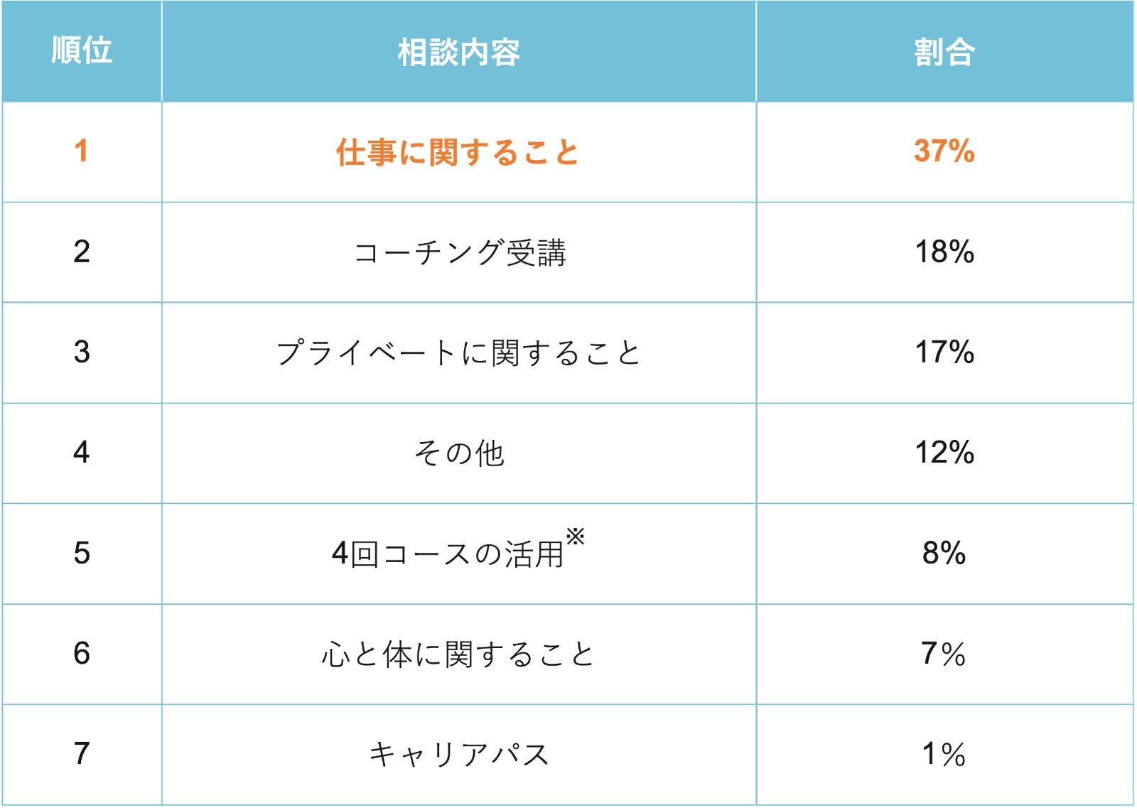 2023年4月の相談内容は、1位「仕事に関すること」37%、2位「コーチング受講」18%、3位「プライベートに関すること」17%