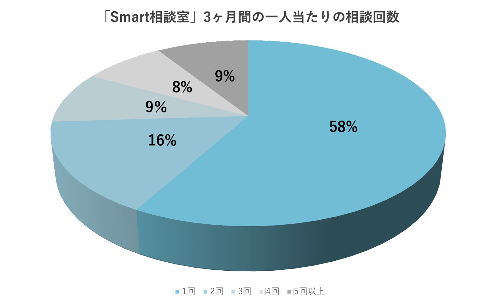 併せて、2023年2月1日〜2023年4月30日の3ヶ月間における、相談者の相談回数についても分析しました。結果として、1回の方が58%、2回の方が16%、3回の方が7%と、74%の方が直近3ヶ月間に1回〜2回という単発に近い相談をされており、26%の方が定期的に相談をされていることがわかります。