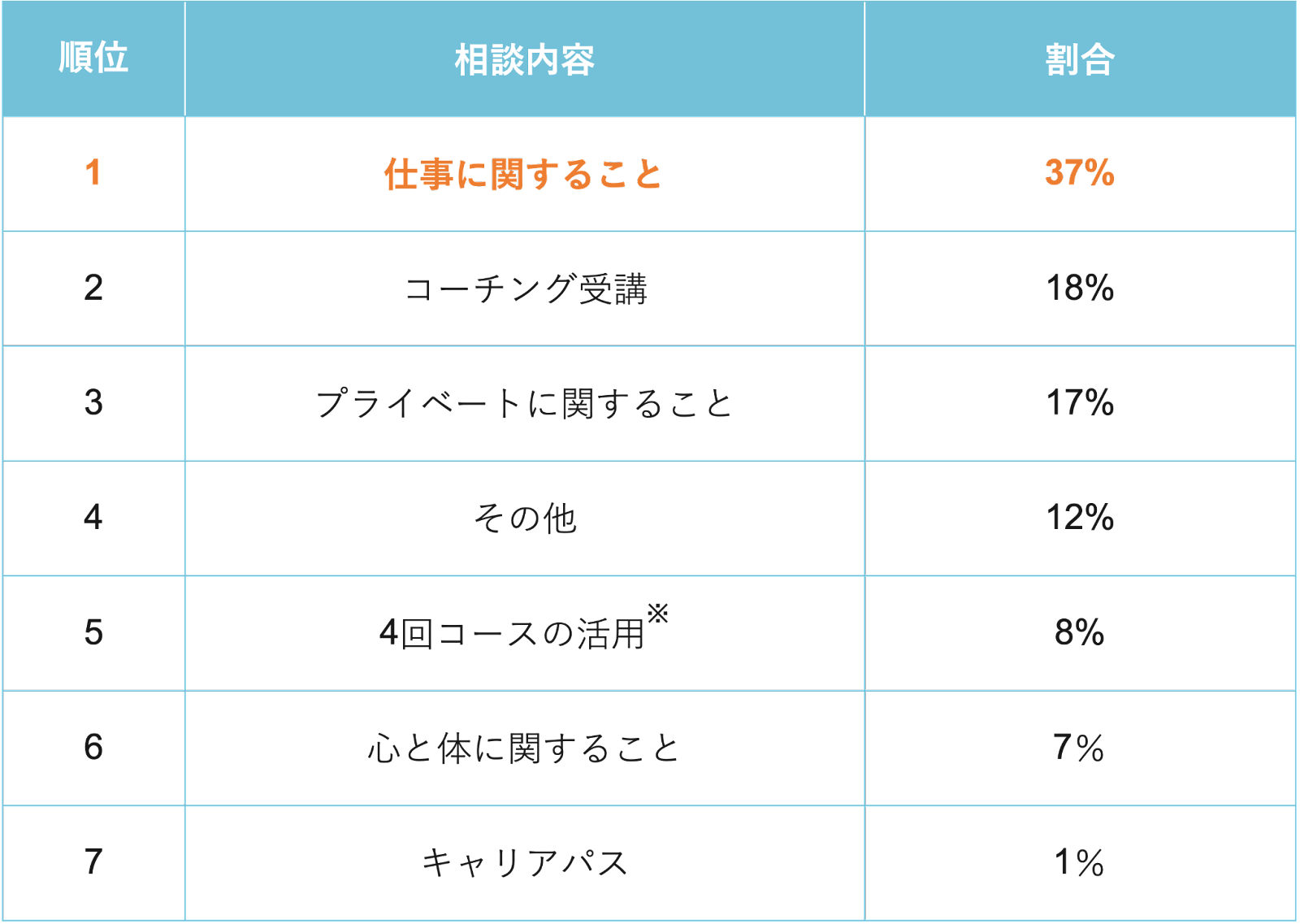 2023年4月の相談内容は、1位「仕事に関すること」37%、2位「コーチング受講」18%、3位「プライベートに関すること」17%