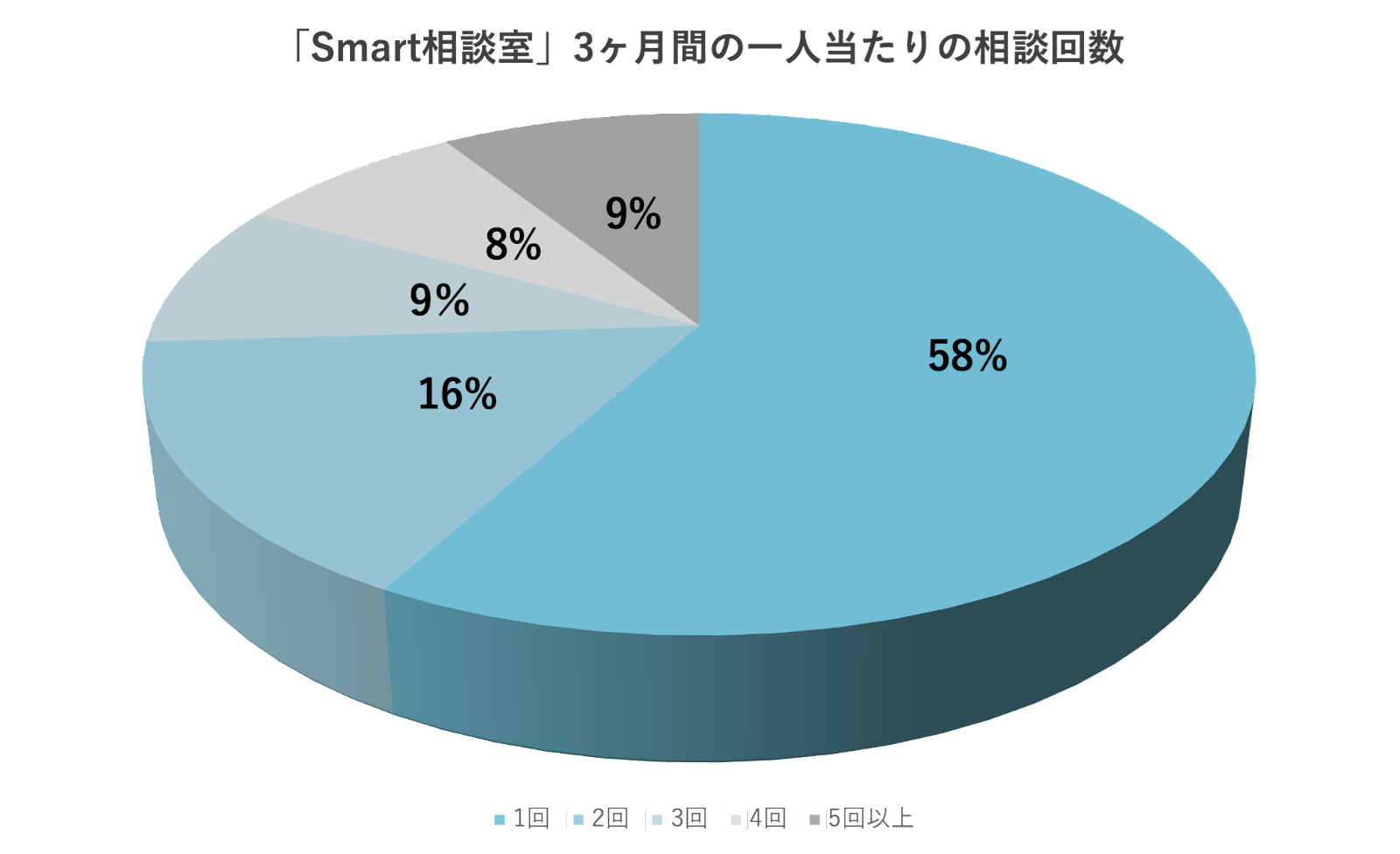 併せて、2023年2月1日〜2023年4月30日の3ヶ月間における、相談者の相談回数についても分析しました。結果として、1回の方が58%、2回の方が16%、3回の方が7%と、74%の方が直近3ヶ月間に1回〜2回という単発に近い相談をされており、26%の方が定期的に相談をされていることがわかります。