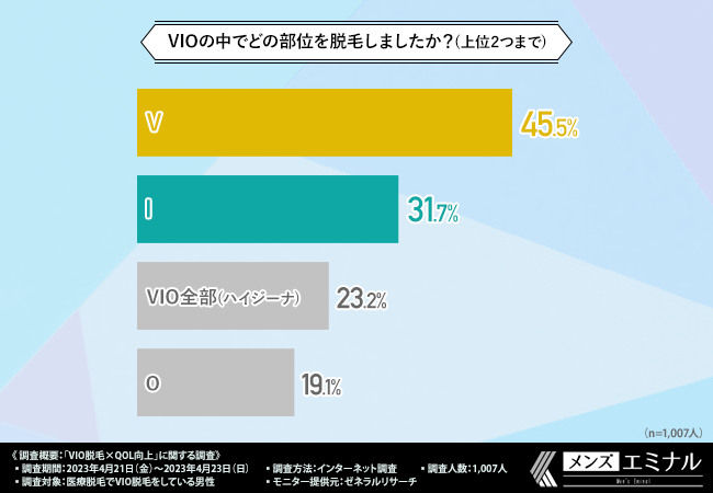 「VIOの中でどの部位を脱毛しましたか?(複数回答可)」と質問したところ、『V(45.5%)』と回答した方が最も多く、次いで『I(31.7%)』『VIO全部(ハイジーナ)(23.2%)』『O(19.1%)』と続きました。