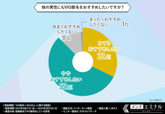 「他の男性にもVIO脱毛をおすすめしたいですか?」と質問したところ、『とてもおすすめしたい(32.4%)』『ややおすすめしたい(55.2%)』『あまりおすすめしたくない(11.3%)』『まったくおすすめしたくない(1.1%)』という回答結果になりました。