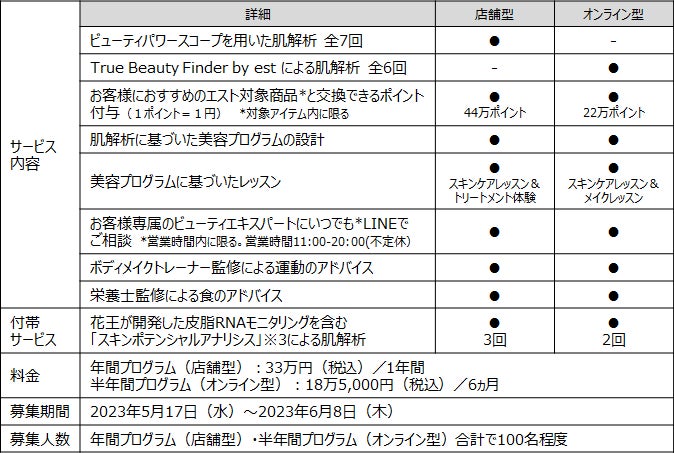 今回は、昨年β版として第一次募集を行った花王の旗艦店「BEAUTY BASE by Kao 銀座店」に通いながら対面でサービスを受けられる店舗型の年間プログラム(年間/33万円)に加え、新たにスマートフォンやパソコン等でどこからでもオンラインでサービスを受けることができるオンラインの半年間プログラム(半年間/18.5万円)の2つのプログラムについて募集をいたします。